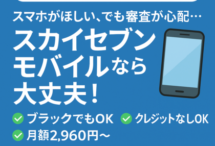 スカイセブンモバイルは、審査なしでご本人様名義のスマートフォンSIMが契約できる総務大臣認定の携帯電話会社です。様々な事情で他社の携帯会社で契約ができない方でも、身分証と銀行口座があればその場でご契約いただけます。